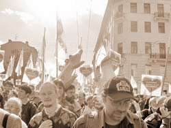 …Перед началом акции в окрестностях концертного зала «Октябрьский» наблюдалось ставшее уже привычным скопление омоновских и милицейских машин. Обыватели задавали вопрос, что случилось. Замечателен был ответ одного из стражей порядка: «Это в честь начала блокады». Кроме того, горожане с удивлением обнаружили, что, оказывается, в Питере реанимированы ДНД – добровольные народные дружины. Дружинники были в новенькой яркой униформе, прямо из швейного цеха, с иголочки. От фотокамер они почему-то отворачивались, как ни убеждал их автор этих строк, что не стоит стесняться, ведь дружина – это хорошо, есть кому хулиганов ловить… Поговорить согласился только один дружинник из Кировского района. О трудных буднях добровольных помощников милиции по искоренению преступности он не смог поведать ничего вразумительного, а на вопрос, что он делает вдали от родного Кировского района, ответил: «Ну… тут митинг, могут быть провокации» - «С чьей стороны?» - «А и с той, и с другой» - «Что вы говорите? Неужели и со стороны властей могут быть провокации?!» - «Естественно!» Достойная уважения откровенность…